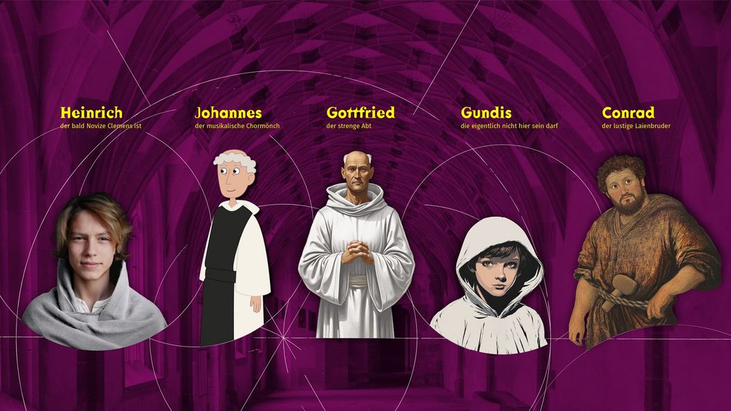 In der Klosterwelt lernen die Gäste spielerisch die Hierarchien und Tagesabläufe der Chormönche und Laienbrüder kennen. Sie erfahren mehr über die Glaubenswelt der Zisterzienser, ihre Regeln bei Tisch oder ihre Arbeit und dürfen auch handwerklich aktiv werden – beim Schreiben wie die Mönche oder beim Bauen eines Rundbogens. Immer mit dabei sind die fünf Charaktere, die eine eigene Rolle im Klosters einnehmen – auch ein Mädchen hat sich unter ihnen versteckt. Zum Schluss geht es zurück in die Gegenwart.